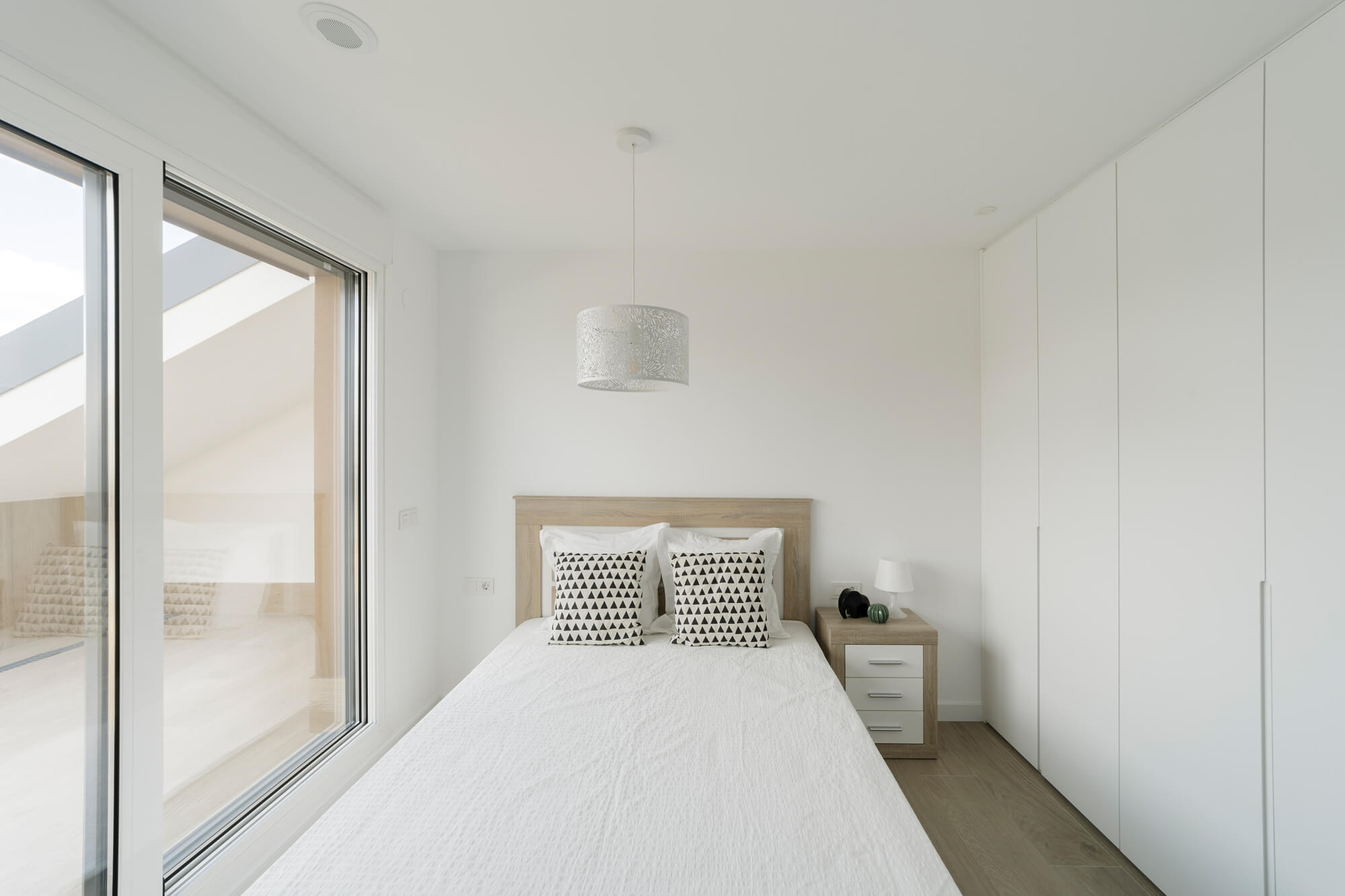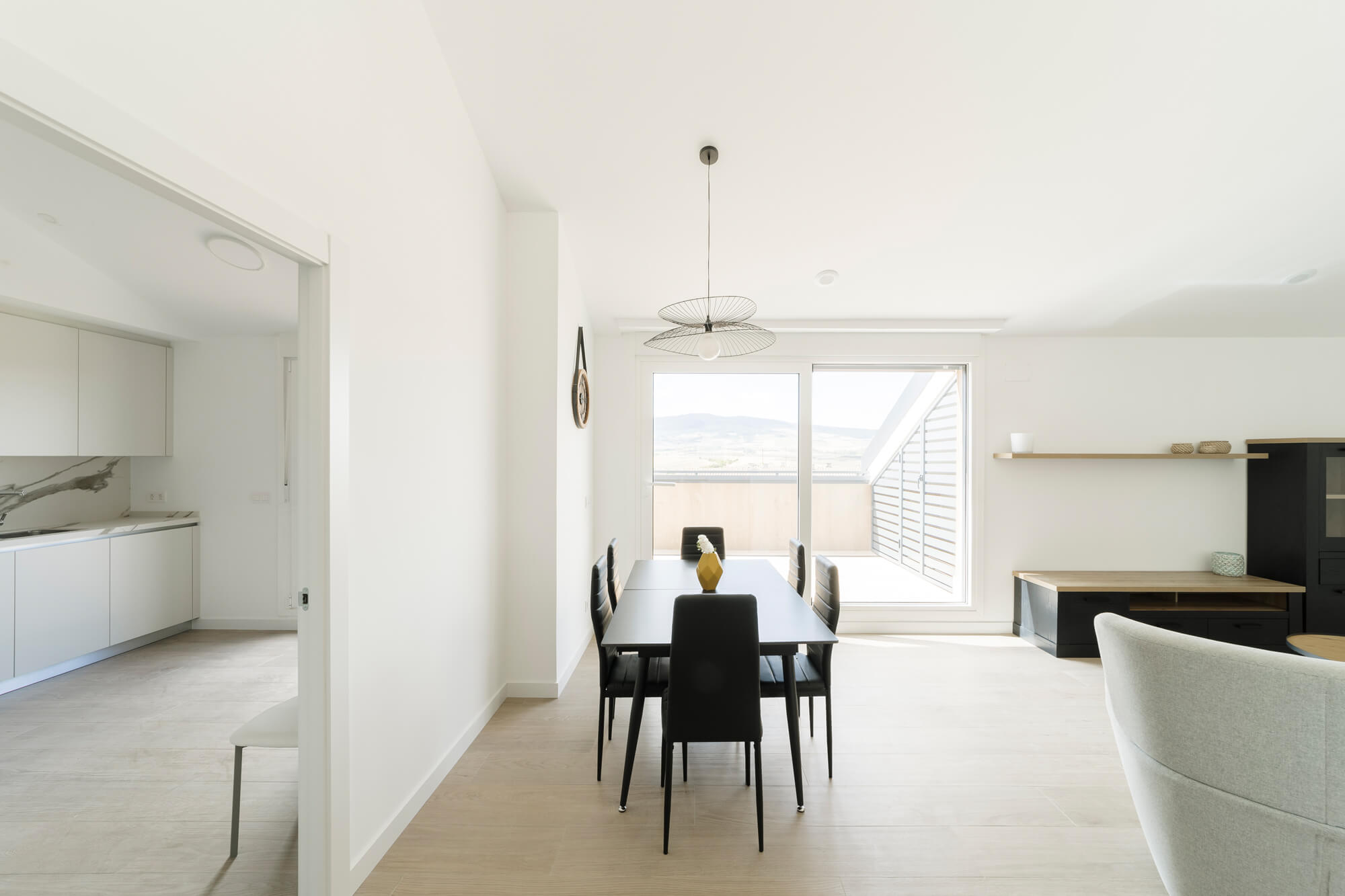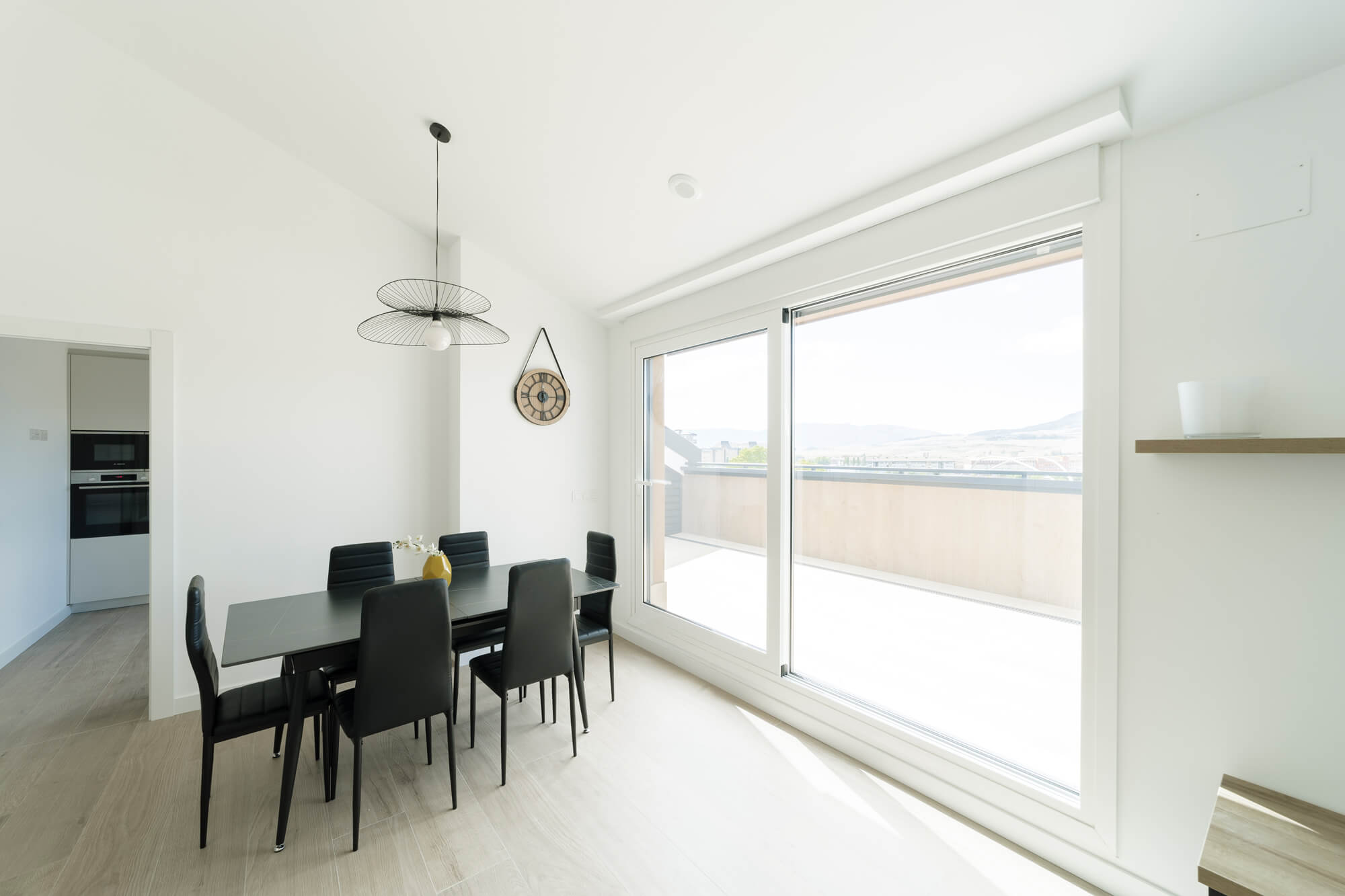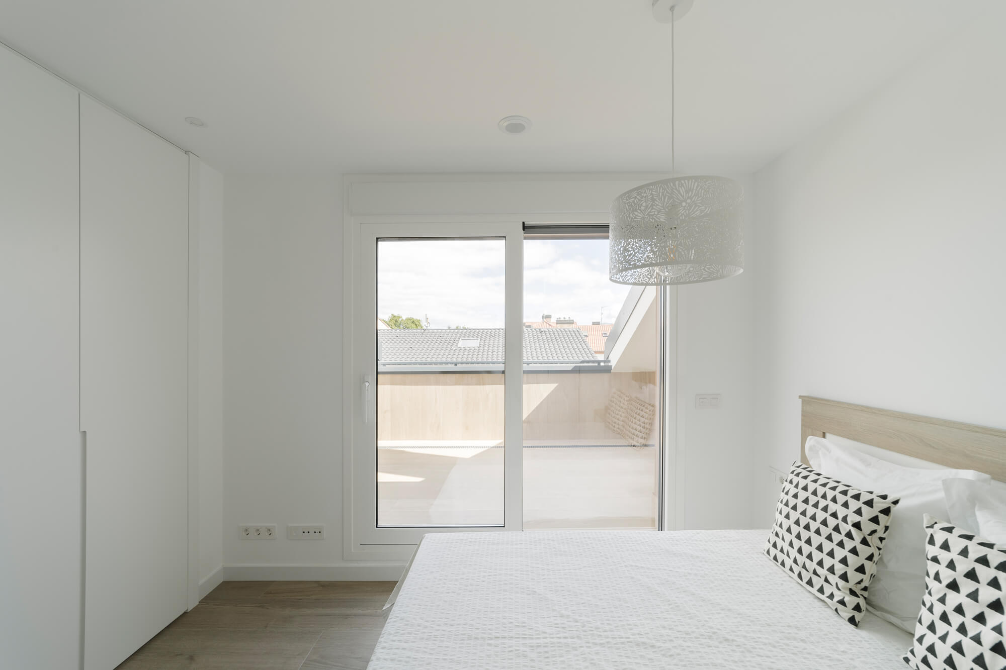 La vivienda se encuentra dentro de una urbanización privada, que cuenta zonas verdes comunes y piscina. Situada en la última planta, la distribución del ático es inmejorable: amplio hall de entrada desde el que podemos acceder a un espectacular salón comedor y a una cocina totalmente equipada, ambas estancias con salida a una gran terraza. Además, cuenta con dormitorio principal, el cual dispone de baño propio y armarios empotrados y dos habitaciones más con baño común.