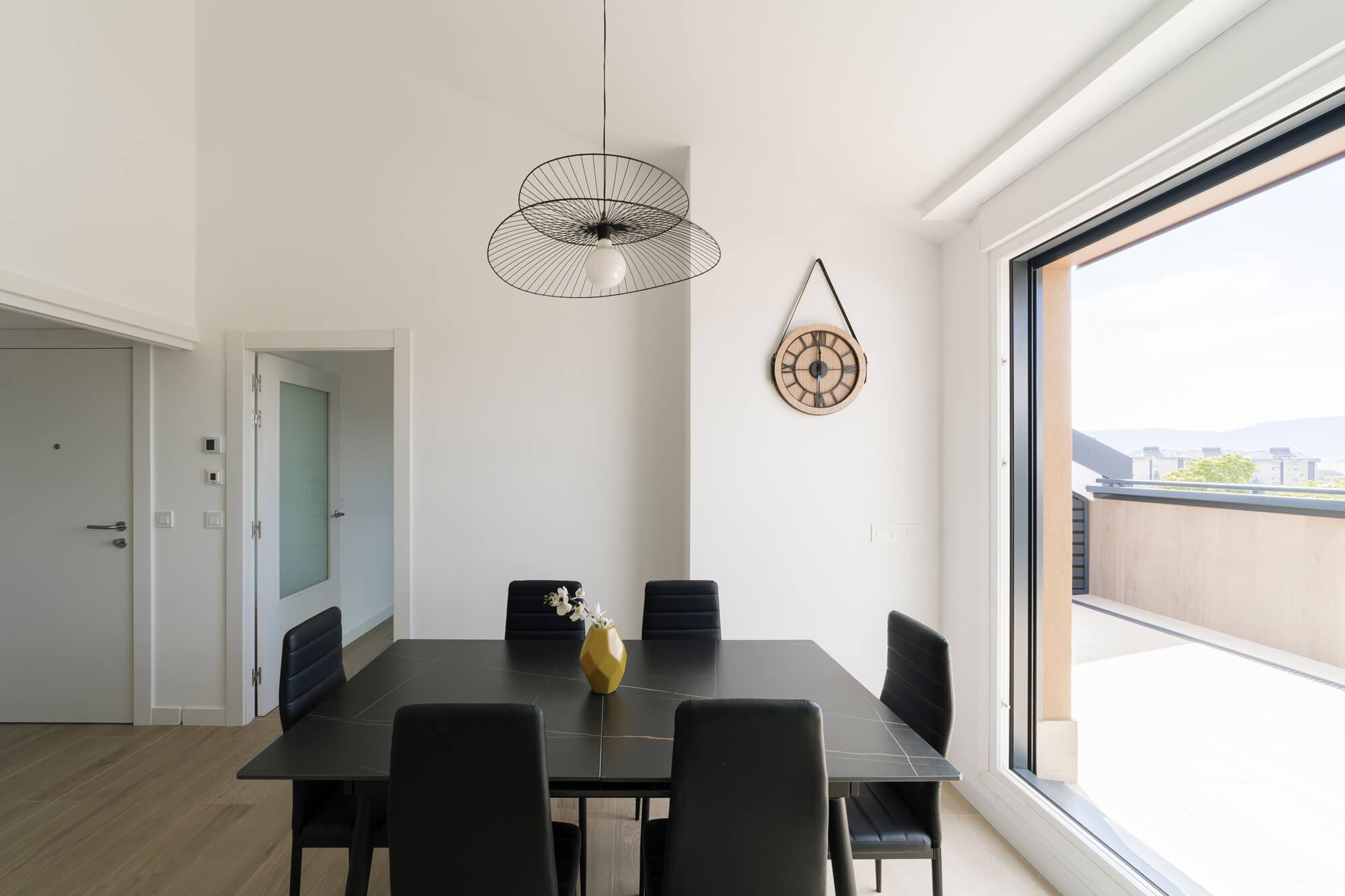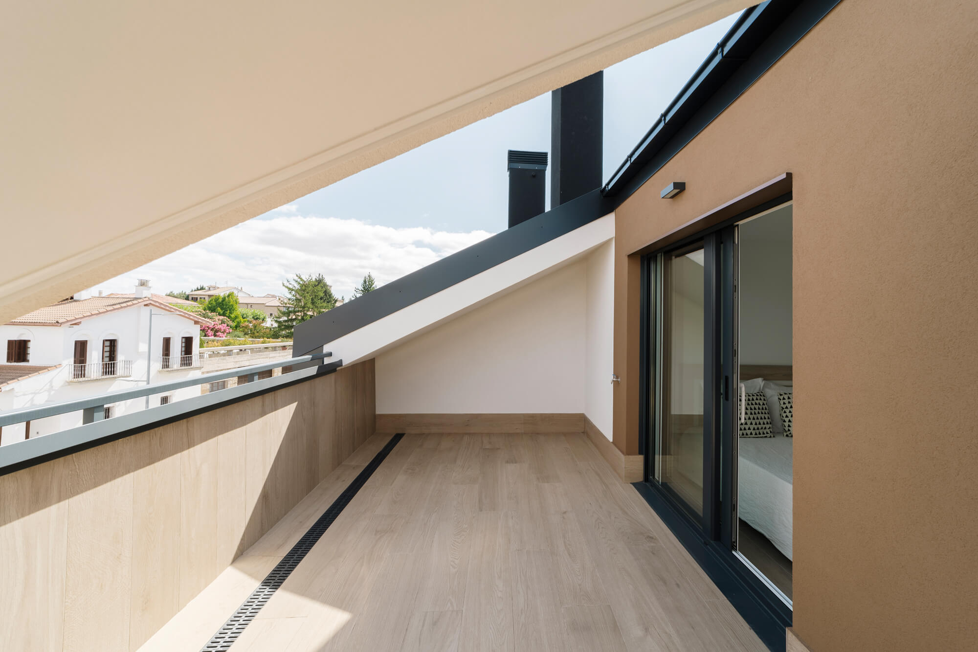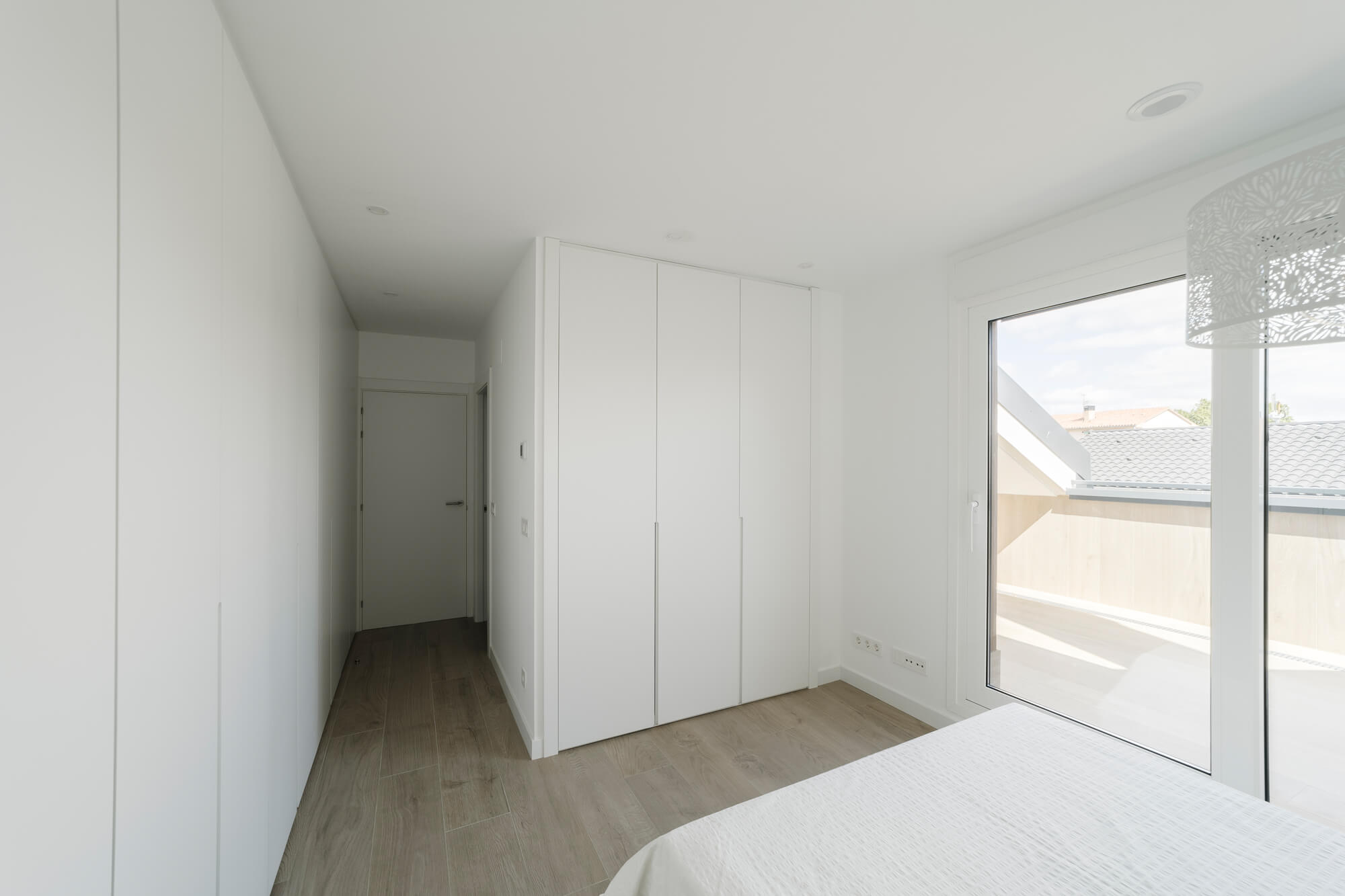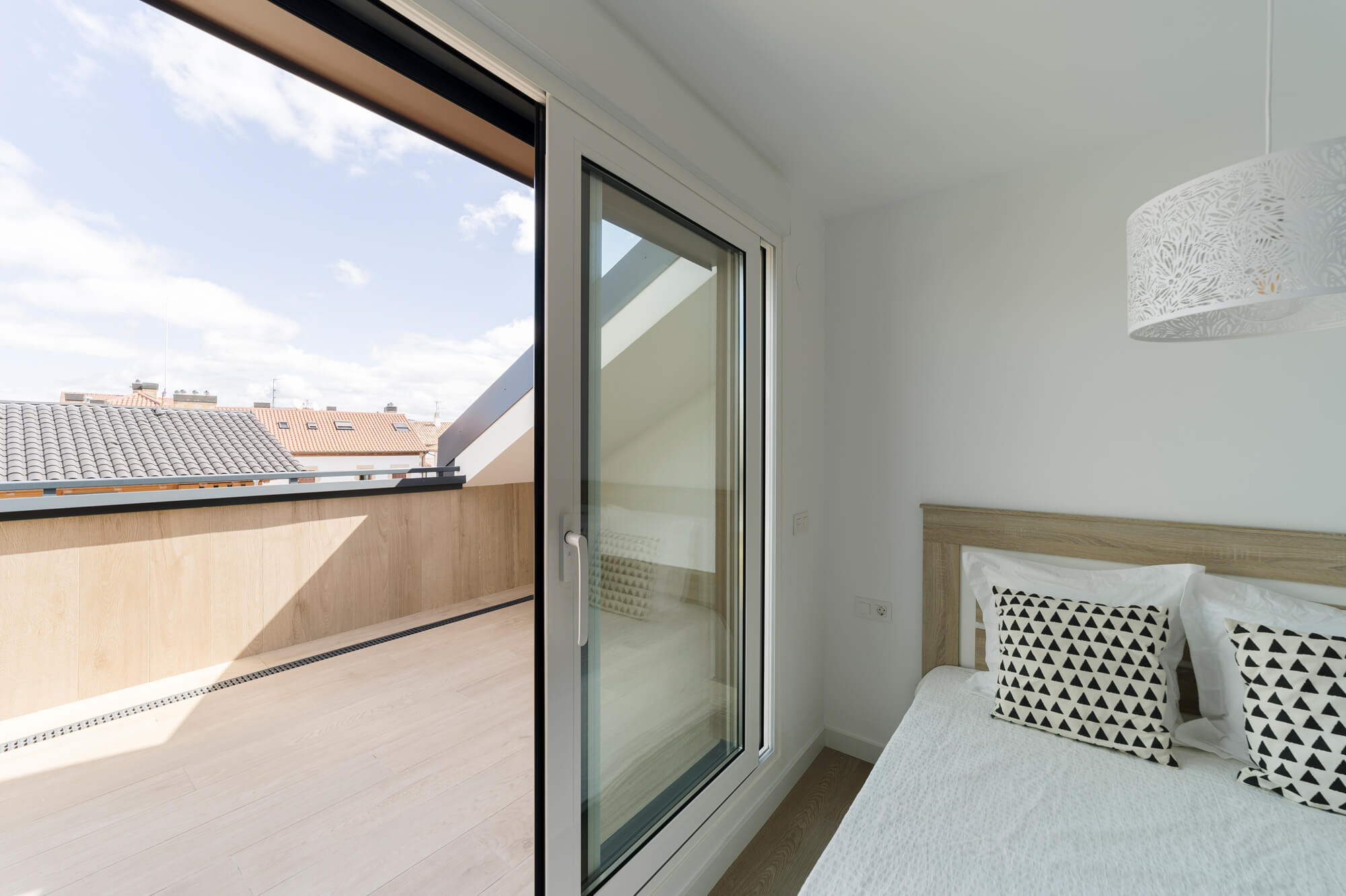 La vivienda se encuentra dentro de una urbanización privada, que cuenta zonas verdes comunes y piscina. Situada en la última planta, la distribución del ático es inmejorable: amplio hall de entrada desde el que podemos acceder a un espectacular salón comedor y a una cocina totalmente equipada, ambas estancias con salida a una gran terraza. Además, cuenta con dormitorio principal, el cual dispone de baño propio y armarios empotrados y dos habitaciones más con baño común.