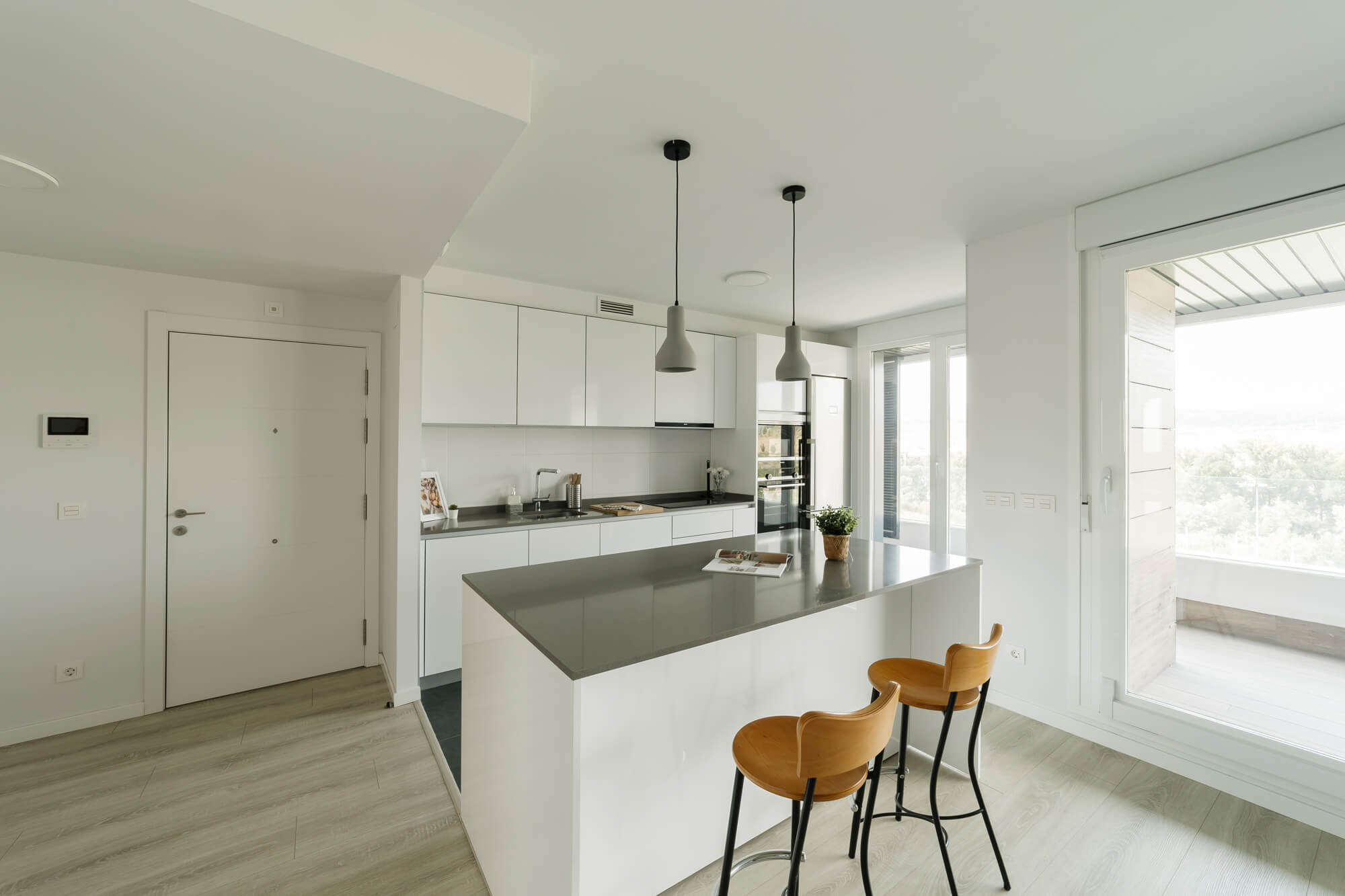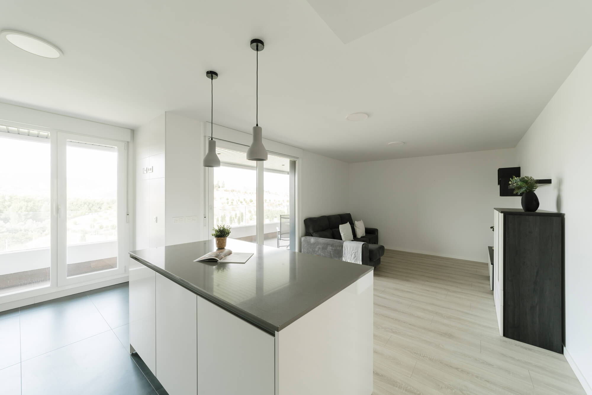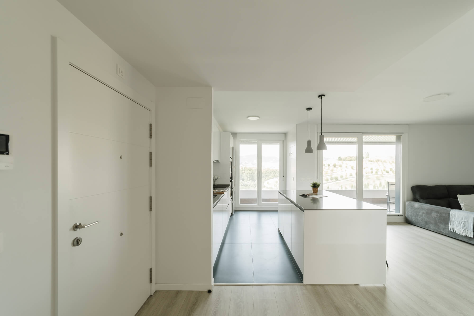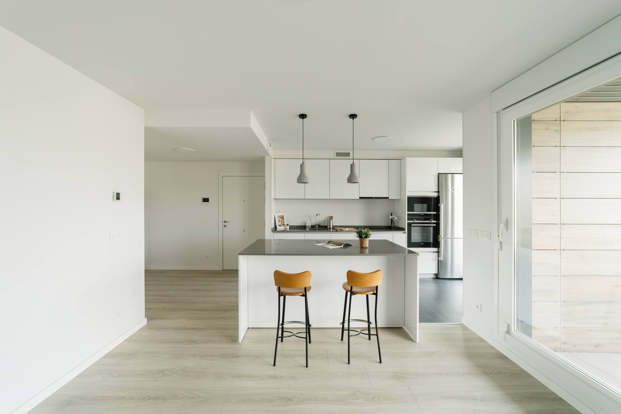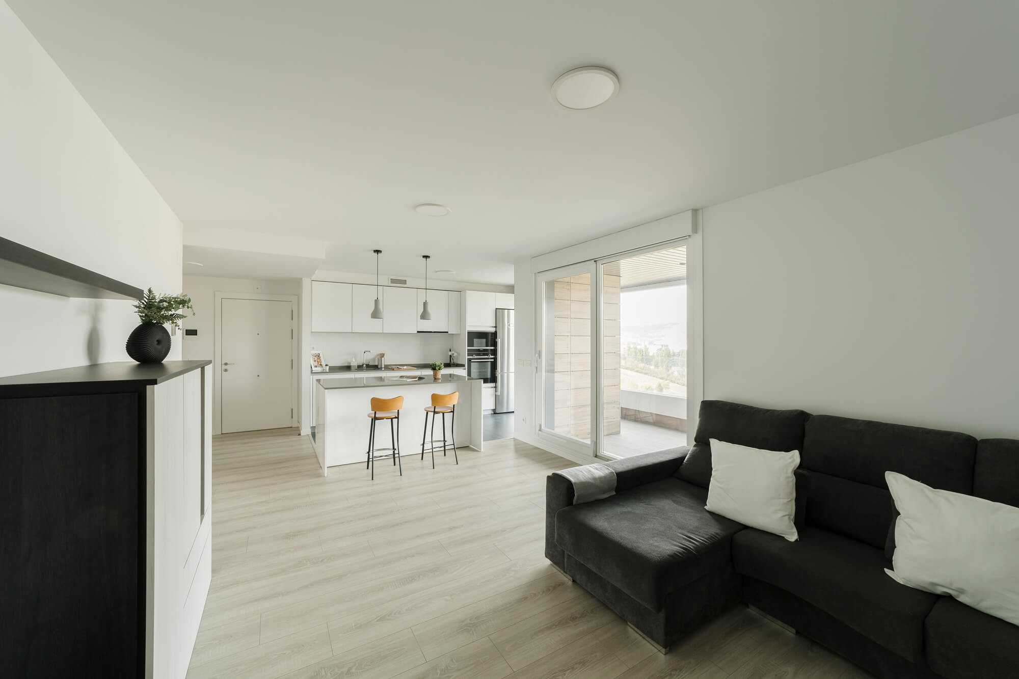 Situada en la séptima planta del edificio, cuenta con una gran cocina con zona de isla y salón con salida a una amplia terraza con unas inmejorables vistas. Además, dispone de una habitación principal con baño incluido en ella, dos habitaciones y un segundo baño equipado.