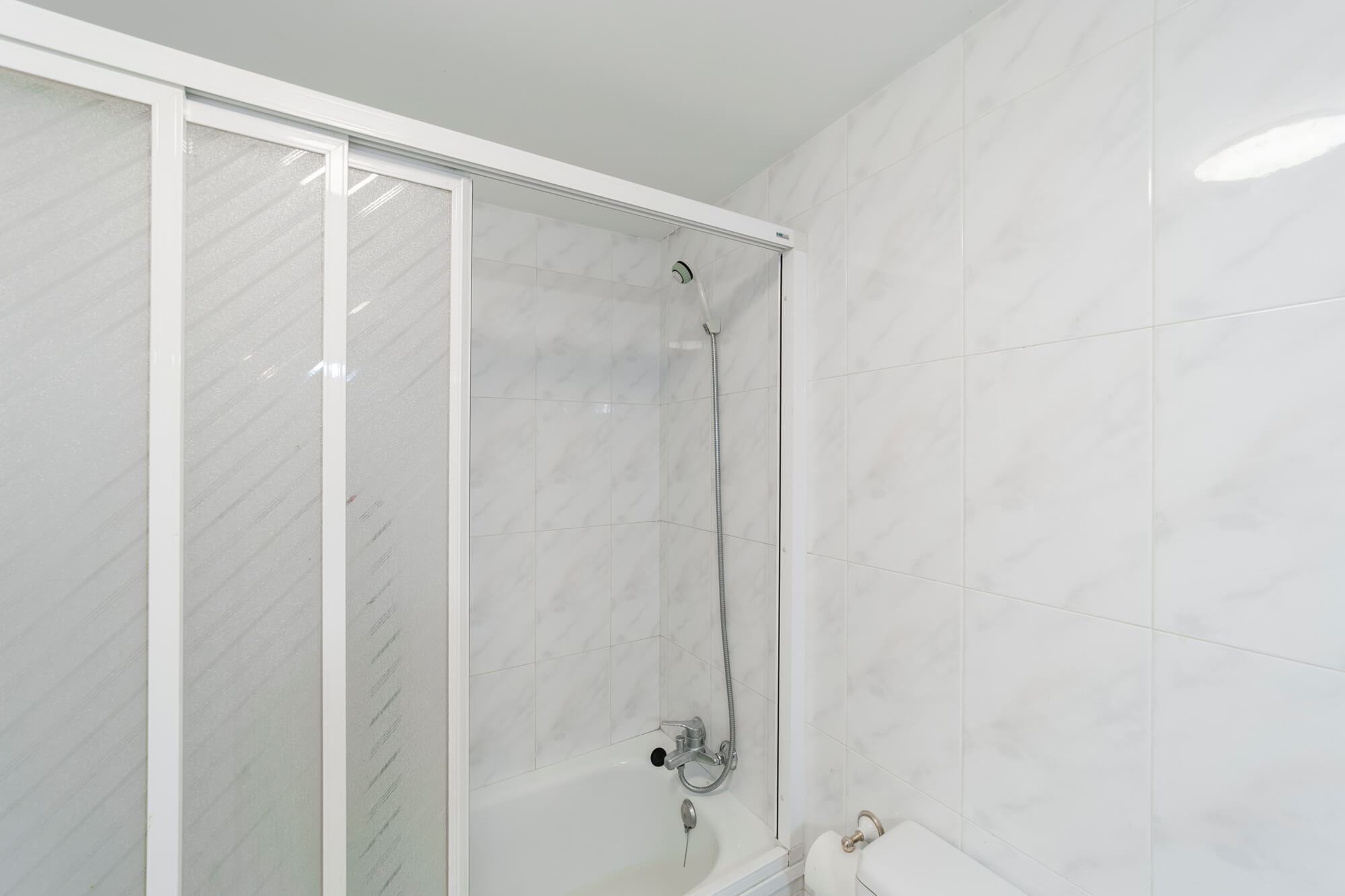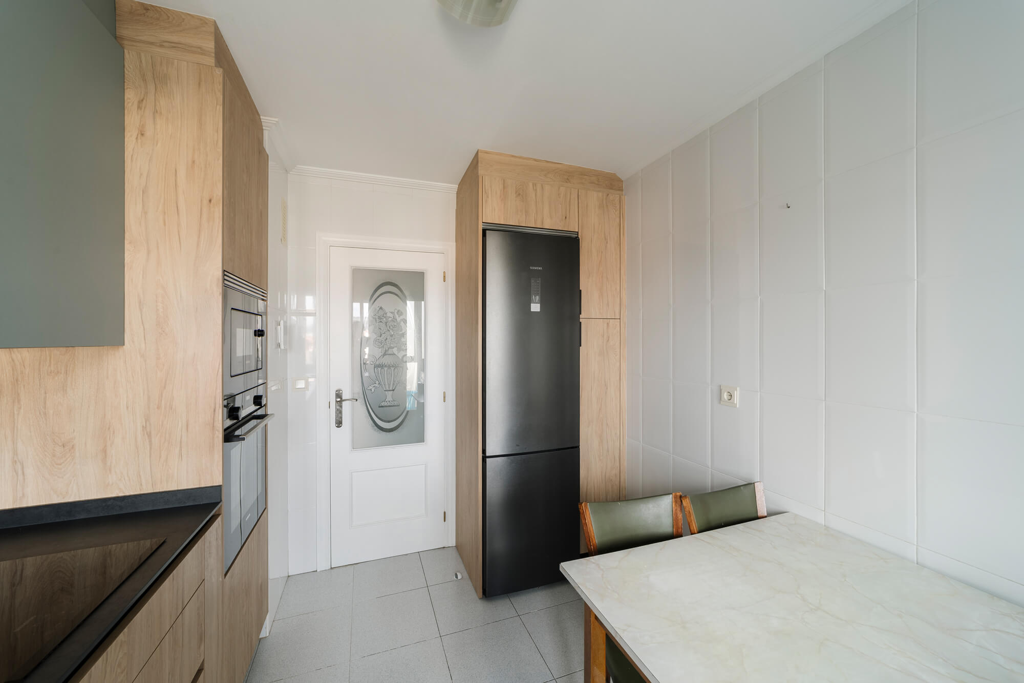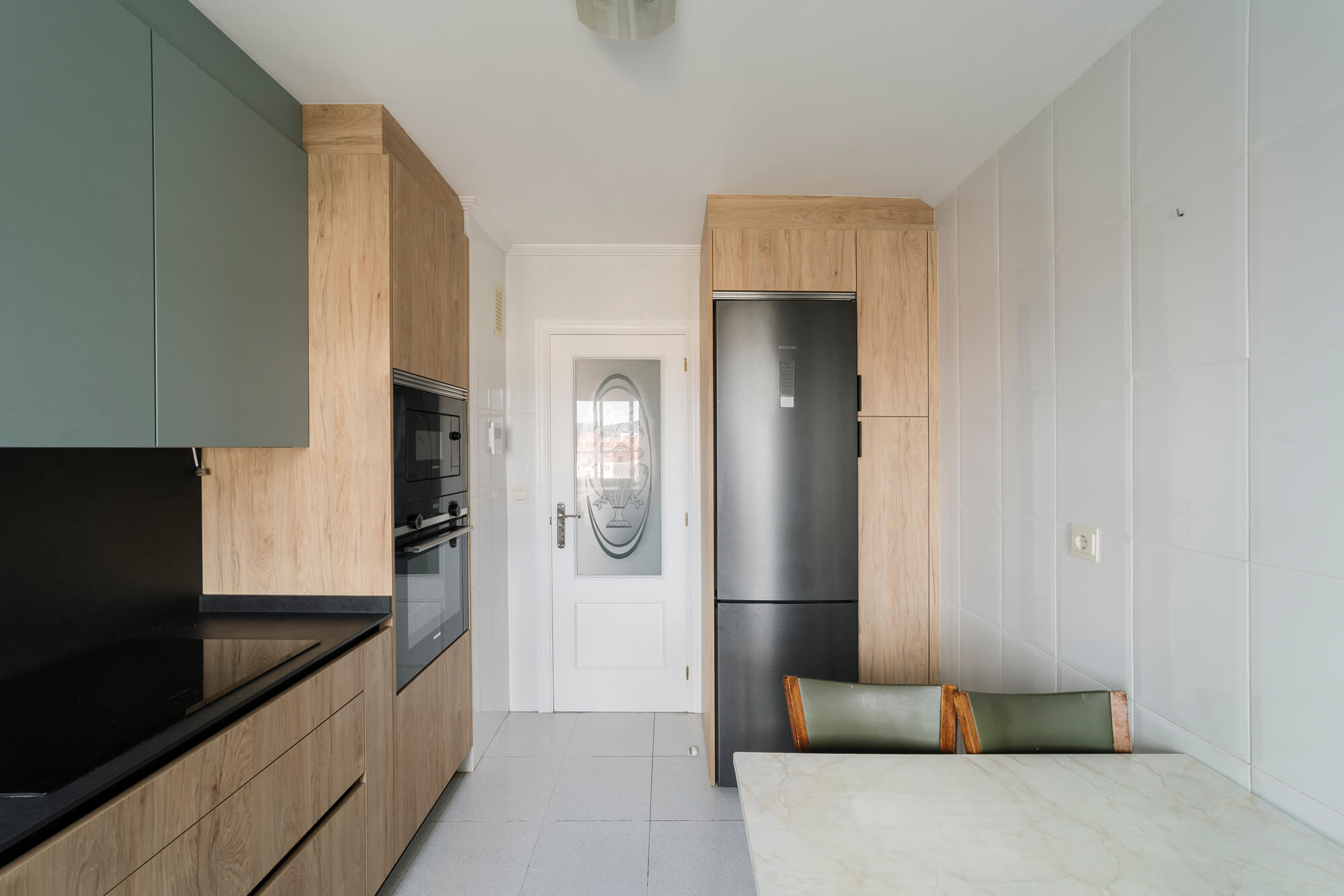 La vivienda consta de un hall de entrada, un salón amueblado, un dormitorio principal con armario empotrado, dos baños interiores completos, dos dormitorios y una cocina recién reformada. El edificio dispone de ascensor y el sistema de calefacción y agua caliente es mediante caldera central con contadores individuales, por lo que el inquilino paga en función del consumo.